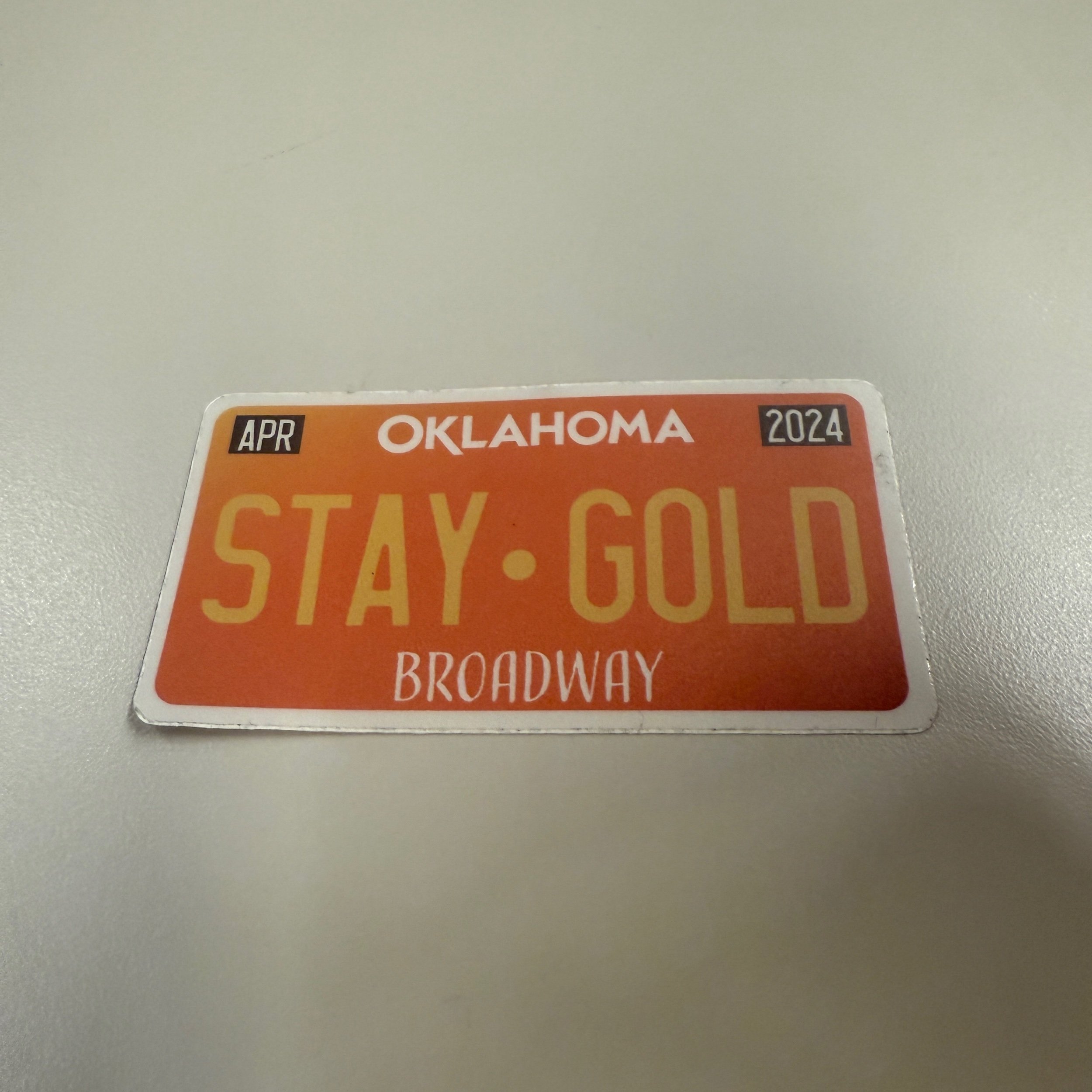 Inspired by the lyric and phrase Stay Gold and the Oklahoma license plate with detail of April 2024 as the tag dates for the opening night.